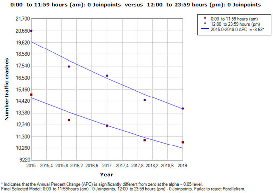 The comparison of traffic crashes between the morning (0:00 to 11:59 h) and the afternoon (12:00 to 23:59 h) showed that the decrease in traffic crashes between the two schedules was parallel (