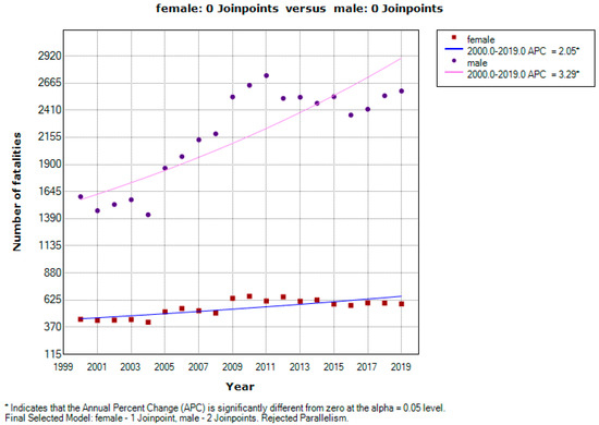 Figure 3, with females presenting an increase of 2.05 per year (95% CI: 1.2 to 2.9) and males increasing by 3.29 per year (95% CI: 2.3 to 4.3). In the comparability test, the number of deaths (males and females) due to traffic accidents was not parallel (the selected model rejected parallelism,
