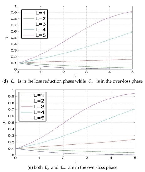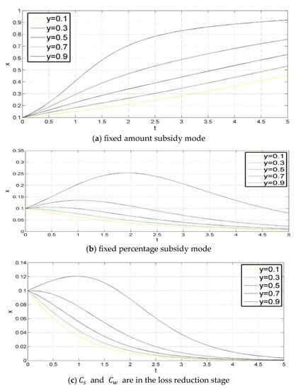 According to Figure 7, using the regressive loss subsidy mode and both Cs and Cw are in the loss reduction stage, when the government loss reduction share ratio z is small, firms will choose the cost saving strategy, and the smaller the loss reduction share ratio, the faster firms choose the cost saving strategy. When the loss reduction share ratio is larger, firms will choose the cost wasting strategy and the loss reduction share ratio. The larger the share of loss reduction, the faster the enterprises choose the cost wasting strategy. At the same time, when the government’s share of loss reduction is small, the effect of reducing the same share to make enterprises save cost is better than when the share of loss reduction is large.
