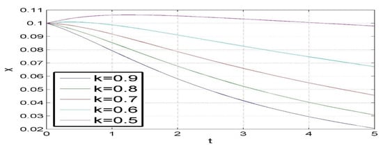The size of the subsidy under the fixed amount subsidy mode has no effect on the probability x of choosing a cost saving strategy for urban rail transit enterprises, so its amount is not discussed in this paper. To study the influence of the initial condition k on the strategy choice of urban rail transit enterprises in the fixed percentage subsidy mode, the interference of the saddle point on the stability of the model is excluded, and other values are taken as the initial values. The values of 0.9, 0.8, 0.7, 0.6 and 0.5 are taken for k, the value interval is 0.1, and the results are shown in Figure 6.