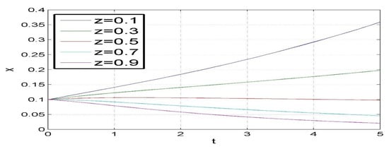 To study the influence of z on the strategy choice of urban rail transit enterprises when both Cs and Cw are in the deficit reduction stage, the interference of the saddle point on model stability is excluded, and other values are taken as initial values. The values of 0.1, 0.3, 0.5, 0.7 and 0.9 are taken for z, the value interval is 0.2, and the results are shown in Figure 7.