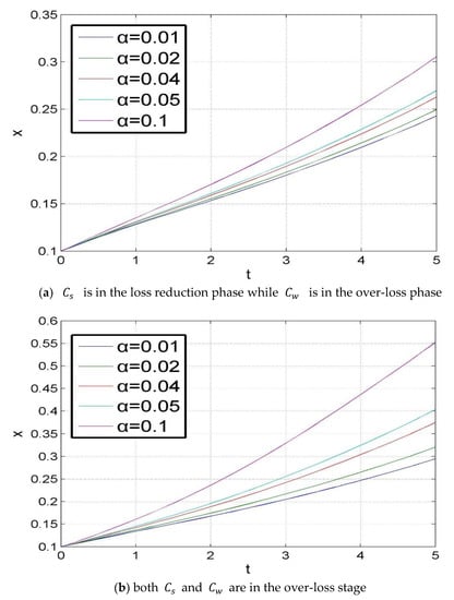 According to Figure 8a,b, when the regressive loss subsidy mode is used and both Cs and Cw are in over-loss phase, the effect of α taking values on x is similar to that when Cs is in the loss reduction phase and Cw is in the over-loss phase. No matter how large the decreasing over-loss subsidy ratio is, the firm will eventually choose the cost saving strategy, and the larger the decreasing percentage of over-loss subsidy, the faster the cost saving strategy will be reached. The main difference is that when both Cs and Cw are in the over-loss stage, the government adopts the same decreasing over-loss ratio to make the firm save costs better than when Cs is in the loss-reducing stage and Cw is in the over-loss stage.