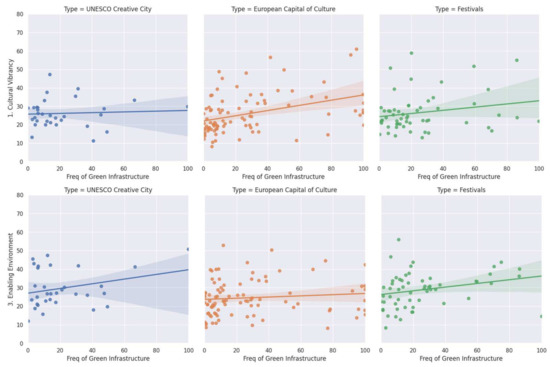 Data on green infrastructure from OpenStreetMap was collected for 184 European cities and a new “green infrastructure” dimension was added to the CCCM. This paper then correlated the amount of green infrastructure in a city to its cultural vibrancy, creative economy, and its enabling environment. Our results show that there is a positive relationship between the amount of green infrastructure in a city and its cultural vibrancy and enabling environment, but less so for its creative economy. Although it is difficult to draw causality from these preliminary studies, this research provides the basis for a future exploration into more complex spatial regression and agent-based models to determine causality and help policymakers to increase inclusiveness through green growth and tourism and improve health and wellbeing.