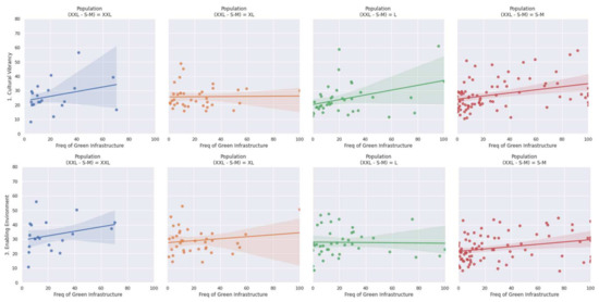 The results vary when the analysis is broken down by city type and size. The correlation of D4.1 Green Infrastructure to C1 Cultural Vibrancy is stronger at 0.40 for European Capital of Culture cities, whereas the correlation of D4.1 Green Infrastructure to the C3 Enabling Environment is weaker for European Capitals of Culture but stronger for UNESCO Creative cities and Festival cities. In terms of city size, when looking at Table 2 the correlation of D4.1 Green Infrastructure to C1 Cultural Vibrancy is stronger at 0.38 for L Cities and 0.34 for S–M Cities compared to bigger cities. Furthermore, the correlation of D4.1 Green Infrastructure to C3 Enabling Environment is stronger at 0.29 for XXL cities and 0.28 for S–M cities. These trends can be seen in Figure 1 and Figure 2 below. The interpretation of these results will be discussed in Section 4.