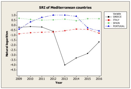 In the SRI category, as Figure 1 and Table 6, Greece is showing significant fluctuations over the period under review, with the most significant drop during the period from 2012 to 2013. Since then and until 2016, Greece has remained in the last place, just below from Italy, which remains at steady negative levels. Portugal, while in 2009 ranking third and at negative levels, managed to have a positive sign as well as the first place in 2014, but since then has declined. Finally, Spain has positive steady course throughout the years.