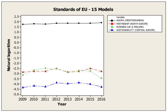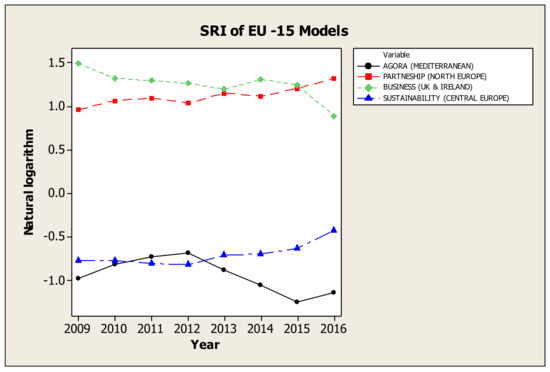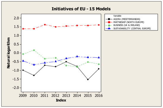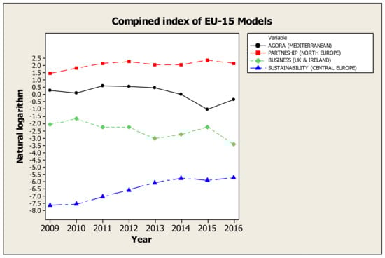 Considering the characteristics of “Agora” model [10], the longitudinal evolution of the aforementioned countries, both in individual indicators and in their combination, may be a very useful tool for constitutions, institutions and governments, which have an active role, in order to locate problems and shortages. At the same time, they can control the efficiency of their policies, so that they can have as model the other countries, those of Northern Europe, to make better decisions and to set effective practices. High scores of Northern Europe, which also are the best globally [6,25,39] show the right way to other countries. Possibly, the rise of CSR could be a step toward to the exit from the financial crisis, as that not only benefits society, not only externalizes the adoption of unwritten ethical rules in the implementation of corporate policy, but it also partly contributes to the improvement of their financial performance of those companies that adopt CSR.