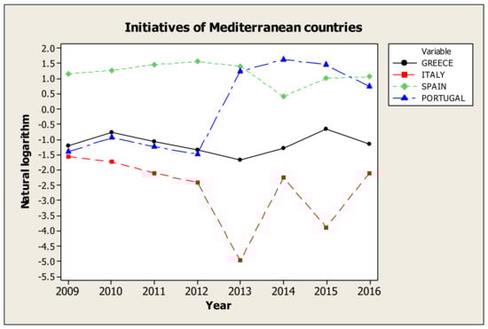 In the Initiatives category, as Figure 3 and Table 8, all the countries have shown significant fluctuations, however, except Portugal, all other countries in 2016 are almost at the same level as in 2009. Portugal, in 2012, showed a steady upward trend and managed to keep positive levels near the level of Spain. Italy and Greece are continuously at negative levels.