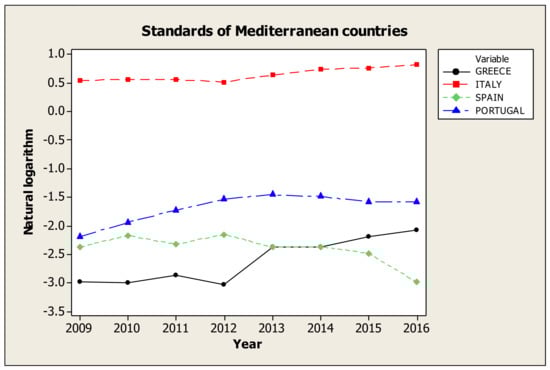 In Standards category, as Figure 7 and Table 12, Italy is the only country that remains continuously to positive levels. The countries of Greece and Spain since 2012 and then, present an opposite trend, Greece rising and Spain decreasing. Portugal is always in the second place, with a steady upward trend, but still at negative levels.