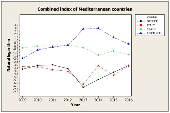 In the same category, the regions of Europe, as Figure 2 and Table 7, show significant differences between them. The Mediterranean and the Central European countries are continuously moving to negative levels, with the difference that the Central European countries show an increasing trend while the Mediterranean a decreasing. The UK was in the first place until 2015, but, since then, both their downward trend and the rising trend of the northern European countries brought them to the second place.