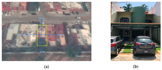 The residential building studied (base case) is a linked, single-family house located in the city of Villahermosa, Tabasco (México). The total building surface area is 198 m2 and consists of a total of 3 floors with 4 bedrooms, a study room, a living-dining room, a kitchen, an office, and 4 bathrooms. As shown in Figure 1, the main façade of the building is orientated to the west.