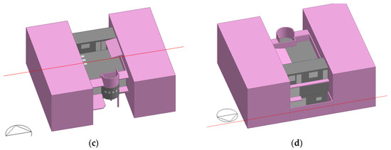Visualization of the 3-D building model located in Villahermosa, Tabasco (Mexico): (a) front view; (b) back view; (c) axonometric front view; (d) axonometric back view.