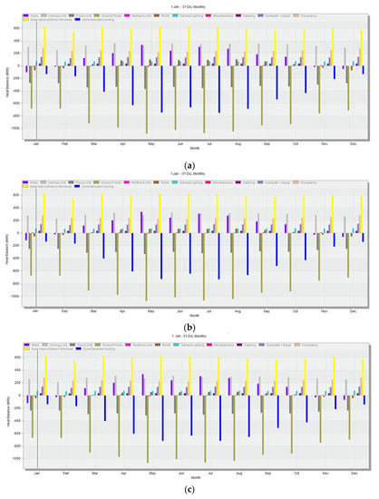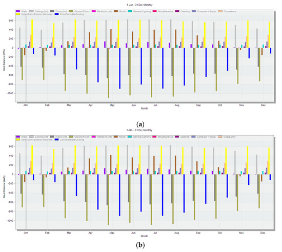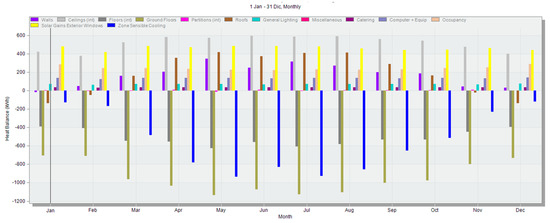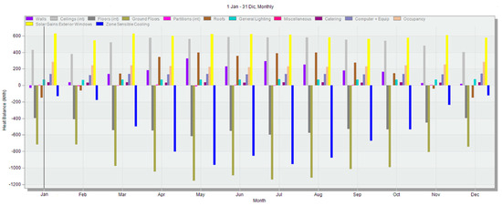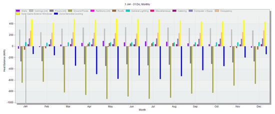 The monthly heat gains result by the base case throughout the year can be seen in Figure 3, caused by walls, ceilings, floors, ground floors, partitions, roof, lighting, miscellaneous, catering, computers and equipment, occupancy, solar gains, and zone-sensible cooling. In this figure, we can see that the greater heat gain is due to the increase in solar gains by exterior windows, followed by the roof, occupancy, and lastly, by the walls. On the other hand, it can be observed that the primary heat loss of the building is due to the interior floors and through the ground floor, which is responsible for reducing the sensible cooling zone of the building.