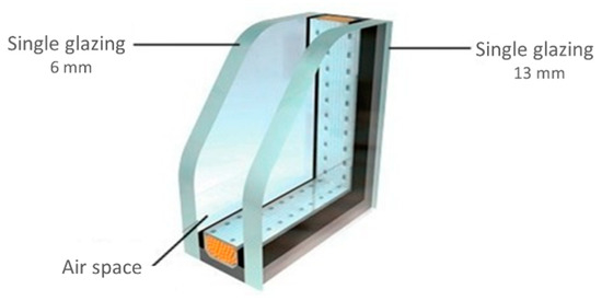 - Exterior windows: To reduce the solar gains, which represent the greatest heat gain, it was proposed to add another glass with a thickness of 13 mm in all the windows placing air in between them (see Figure 4). In the same way, since the frames influence the thermal behavior of the window, it was proposed to change the aluminum frames to wooden frames and place wooden frames on exterior windows with “no frames”, to improve their thermal properties. Table 6 describes the thermal properties of the exterior windows, both base case and with the proposed passive design strategy.