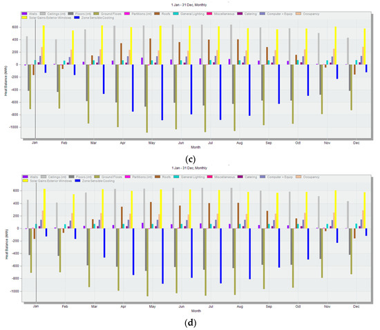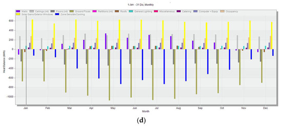 Figure 7. Heat gains/losses in the building with the proposed passive design strategy on walls in compliance with: (a) NMX-C-460-ONNCCE-2009 “Minimum” range; (b) NMX-C-460-ONNCCE-2009 “Habitability” range; (c) NMX-C-460-ONNCCE-2009 “Energy saving” range; (d) NOM-020-ENER-2011.