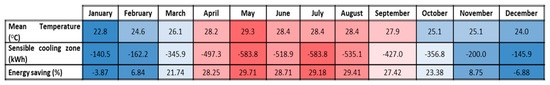 On the other hand, we can corroborate that the behavior of sensible cooling zone is related to the average temperatures of the state of Tabasco, since the higher the outside temperature, the greater the sensible cooling required by the building. The months of May and July are the months with the highest sensible cooling in the area, with −583.78 kWh. Moreover, the percentage of energy savings in consumption from the base case shows that the more sensible cooling zone is required in the building, the higher the percentage of energy saving is achieved. However, January and December showed an increase in energy consumption needed to achieve thermal comfort (see Figure 9).
