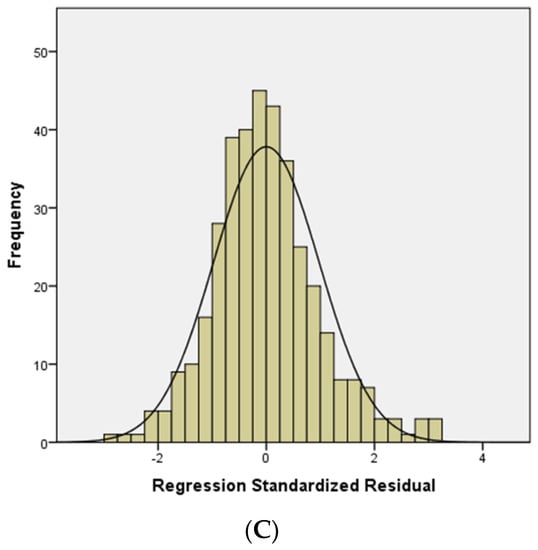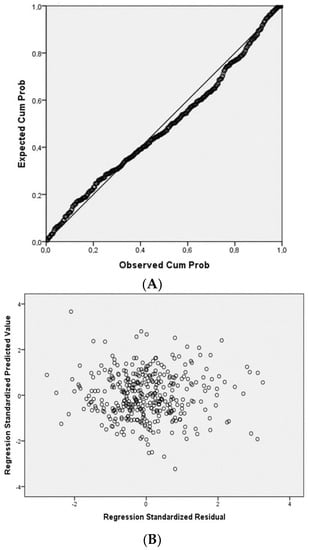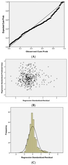 The scatter plot in Figure 1B showed that there was a consistent relationship between the regression standardized residual and standardized predicted values, which indicates the validity of the homoscedasticity assumption. The third assumption was to check the normality of the error distribution; in other terms, this hypothesis is used to check if a dataset is well modeled by a normal distribution. Figure 1C, which compares the empirical cumulative distribution function of a dataset with a specified theoretical cumulative distribution function, shows that the residual values of the regression model followed a normal function of distribution, which confirmed the validity of the normality residual distribution.