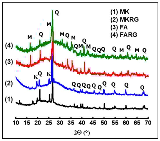 X-ray diagrams of the binders: FA/FARG (a), MK/MKRG (b), and MK/FARG (c) (Q: quartz, M: mullite, K: kaolinite).