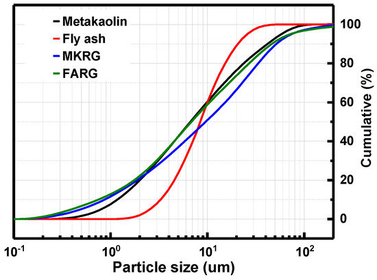 Manufacturing the new materials involves two steps. In the first step, two shades of geopolymer materials, intended to simulate waste, were prepared. For the fly-ash-based geopolymer (FAref), the fly ash (FA) was mixed with a sodium silicate activating solution (SAS) with SiO2/Na2O molar ratio of 1.2 and L/S = 0.58, then cured at 80 °C for 20 h. For the metakaolin-based geopolymer (MKref), metakaolin (MK) was mixed with a similar activating solution at L/S ratio = 0.83, and then cured at 60 °C for 5 h (Table 2). Different curing times and temperatures were used due to the the difference in reactivity of these two powders with respect to the activation solution. Indeed, the morphology of the fly ash powder is relatively coarser, and its vitreous phase made up of glassy spherules is more energetically stable, while metakaolin powder is finer and the structure of its amorphous phase is formed of disorganized layers. This results in a higher reactivity. Therefore, the fly ash dissolution kinetic is slower than the metakaolin one and thus requires a higher temperature and a longer holding time. The materials obtained were stored for a year in the open air in order to simulate aging in an ambient environment [26]. They were then crushed using a roller mill, then sieved to obtain very fine powders of recycled geopolymers referenced FARG and MKRG for FA and MK, respectively. Mean grain size was less than 90 µm for both recycled geopolymer powders, with size distribution comparable to the starting materials (MK and FA), see Figure 2.