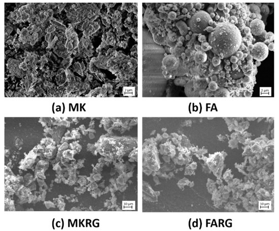 SEM microphotographs of the powders: MK (a), FA (b), MKRG (c), and FARG (d).