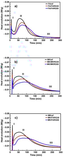 - The occurrence of a first exothermic peak from the very first moments (domain I) is attributed to the wetting and dissolution of the reactive aggregates. The alkaline attack destroys the bonds within the amorphous phase and produces monomers, thereby generating heat exchange [7,37,38]. The amplitudes of the peaks of the reference materials MKref and FAref (without additives) are the highest. For each of the three formulations, the amplitude gradually decreases as the content of added recycled geopolymer is increased. This trend can be explained by the increasing substitution of FA and MK, which contain amorphous phases that are very reactive towards the activation solution, taking into account the curing temperature [29,39,40], by recycled geopolymers which are weakly or not at all reactive under these conditions [25].