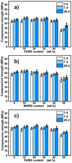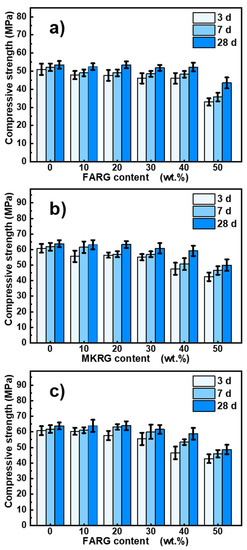The evolution of the compressive strength of the binders FA/FARG, MK/MKRG, and MK/FARG at 3, 7, and 28 days of curing is shown in Figure 7.