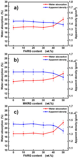 Variations of water absorption and density of the binders as a function of the substitution rate of recycled geopolymer added: FA/FARG (a), MK/MKRG (b), and MK/FARG (c).