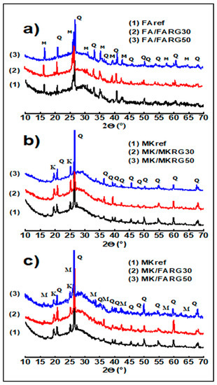 Figure 10 shows the diffractograms of FA/FARG, MK/MKRG, and MK/FARG after 28 days of cure. It is obvious that the spectra of the two materials FA/FARG (Figure 10a) and MK/MKRG (Figure 10b) overlap perfectly with those of the reference geopolymers FAref and MKref, respectively. This indicates that no new crystalline phase was formed during exposure of the reference materials to ambient conditions for 1 year. FA/FARG materials are composed of quartz and mullite, which are inert phases originating from the alkaline attack of fly ash, and of an amorphous phase identified by the glassy dome located in the angular range 20° < 2θ < 35°. MK/MKRG materials consist of quartz, traces of residual kaolinite not transformed by the heat treatment applied to obtain the kaolin, and of an amorphous phase. On the other hand, MK/FARG blends (Figure 10c) are composed of the MK reference matrix (characteristic lines of quartz and residual kaolinite) and mullite (glassy dome formed from FARG waste).