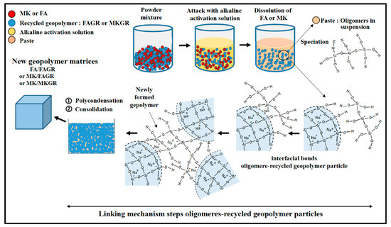 The summary of the results obtained in the fresh state by monitoring the workability and the geopolymerization process shows that the powders of recycled geopolymers are chemically inert or weakly reactive with respect to the alkaline solution. In the hardened state, it appears that the substitution of the raw materials FA and MK for the recycled geopolymers FARG and MKRG up to the rate of 50 wt.% does not affect either of the structural characteristics. This is confirmed by the SEM observations of the fracture surfaces that show features similar to those of the reference matrices, which do not make it possible to distinguish the recycled geopolymers from the newly formed geopolymers. This is accompanied by a slight decrease in mechanical strength (less than 20%), with a mean value around 48 MPa. After the introduction of sand aggregates for the preparation of mortars, one could expect a drop in mechanical strength. Indeed, the proportion of reactive aluminosilicate powder (metakaolin or fly ash) is low and only represents 15% by mass of all the solid materials in the mixture (sand, reactive aluminosilicate powder, and recycled geopolymer powder). However, mortars have high mechanical strengths (around 50 MPa). This finding confirms the strong cohesion of the recycled geopolymer—a newly formed geopolymer phase entity, which behaves similar to a unique binding matrix. In a study on materials consisting of geopolymer matrices based on metakaolin and glass beads aggregates, Zhang, L. et al. [44] attributed the good mechanical strength to the creation of a chemical bond at the matrix–filler interface. The amorphous structure of these glasses and their composition based on silicon and aluminum have similarities with those of geopolymers and their reactivity in the presence of the activating solution. These data prompted us to propose a model that represents the interfacial interaction between newly formed geopolymer and the aggregates of recycled geopolymers (Figure 13), which can be described as follows. The alkaline activation dissolves the reactive materials MK and FA to form aluminosilicate oligomers. The reaction of these with the chemical species present on the surface of the recycled geopolymer aggregates leads to the formation of chemical bridges. A gel then forms, which will gradually develop with the polycondensation to stick the aggregates together. The set of newly formed geopolymers and the recycled aggregates then behave as a single binding matrix.