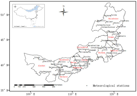 Inner Mongolia (37°24′–53°23′ N, 97°12′–126°04′ E) is a long and narrow province located at middle to high latitudes on the northern border of China (Figure 1). The terrain mostly belongs to the plateau region and stretches from the northeast to southwest. It has an area of 1.183 × 106 km2, accounting for approximately 12.3% of the total area of China [33]. The topographic conditions create unique natural conditions and natural resources [34]. Controlled by the high pressures in Mongolia, this region has a typical temperate continental monsoon climate with four distinct seasons: a dry windy spring, short hot summer, a sharp decrease in temperature in the autumn and early frost, and cold and long winters [16].