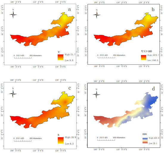 - Tong, S.Q.; Li, X.Q.; Zhang, J.Q.; Bao, Y.H.; Bao, Y.B.; Na, L.; Si, A.L. Spatial and temporal variability in extreme temperature and precipitation events in Inner Mongolia (China) during 1960–2017. Sci. Total Environ. 2019, 649, 75–89. [Google Scholar] [CrossRef]