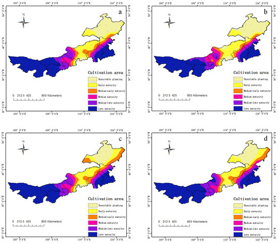 During 1959–2018, significant changes took place in the cultivation patterns of spring maize in Inner Mongolia (Figure 3). The unsuitable planting areas gradually decreased, early maturity planting areas were gradually replaced by medium maturity and medium-late maturity maize areas, and the late maturity varieties accounted for the largest proportion. The planting boundaries of different maize maturity types moved northward and gradually expanded to the northeast, and the most obvious change appeared after 1999.
