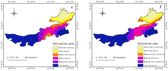 Changes in the cultivation patterns of spring maize varieties of different maturities (late, medium-late, medium, medium-early, and early) from 1961 to 2010 in Inner Mongolia. (a): 1959–1968, (b): 1969–1978, (c): 1979–1988, (d): 1989–1998, (e): 1999–2008, (f): 2009–2018.