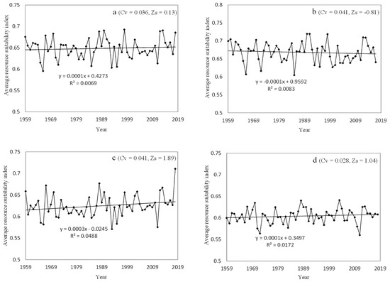 Temporal changes in climate suitability of spring maize in Inner Mongolia from 1959 to 2018. (a): All regions of Inner Mongolia, (b): Eastern region, (c): Central region, (d): Western region.