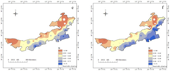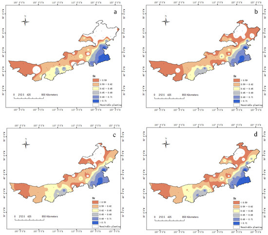 From 1959 to 2018, the climate suitability of Inner Mongolia showed an overall but insignificant upward trend; the climate suitability was between 0.59 and 0.69, and the average suitability was 0.65 (Figure 4a). Among the regions, the eastern part of Inner Mongolia had the highest suitability for spring maize, with an average suitability of 0.67 and a range of 0.60–0.72, showing an overall but insignificant downward trend (Figure 4b). The climate suitability of the central region was moderate, with an overall and significant upward trend (p < 0.05), and ranged from 0.60 to 0.66, with an average value of 0.62 (Figure 4c). The western region had the lowest climate suitability, with an average value of 0.6, and a range between 0.56 and 0.67, showing an overall but insignificant upward trend (Figure 4d). The rainfall in Inner Mongolia was mainly concentrated in the central and eastern regions (Figure 2d). The change in the occurrence of maize varieities with rising temperature was most remarkable in the central region, leading to a significant increase in climate suitability of this region. The eastern part of Inner Mongolia has had the highest climatic suitability due to abundant sunlight, temperature, and rainfall. However, as the temperature rises, and some unsuitable maize planting areas in at high latitudes are transformed into early maturity, a downward trend was observed in the overall suitability in the eastern area. Meanwhile, the climatic suitability of spring maize was low in the western region due to low latitude, high solar radiation, and temperature in the western region, where rainfall was the main limiting factor. The climate suitability changes in all regions of Inner Mongolia showed weak variability (CV < 0.042). In general, as the temperature rises, the synergistic effect of light, heat, and water in the spring maize planting areas will increase, and all regions of Inner Mongolia will become more conducive for the growth and development of spring maize.