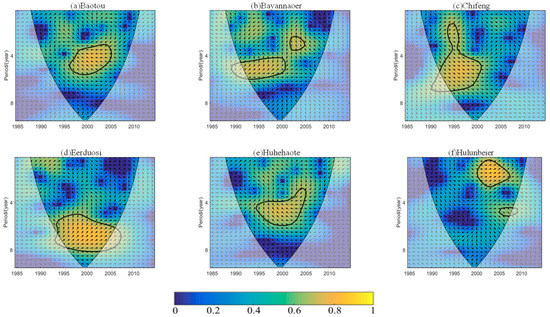 Correlation analysis of climate suitability and climate-induced yield cannot derive the interdecadal relationship between these quantities. However, cross-wavelet analysis can solve this problem effectively. The coherence characteristics of the waves demonstrate that when the periods of the waves are the same and the phase difference meets certain conditions, there is a coherence effect between the waves. Through the XWT of climate suitability and climate-induced yield, the response relationship between them can be discussed. Figure 6 shows the cross-wavelet power spectrum of climate suitability and climate-induced yield for the six regions selected in the first stage. In Baotou, the climate suitability and climate-induced yield have a resonance period of 3–6 years (Figure 6a), mainly concentrated between 1996–2005. In Bayannaoer area, the resonance periods of 2–4 years from 2001 to 2006 and 4–6 years from 1989 to 2001 are shown respectively (Figure 6b). In Chifeng, there is a resonance period of 2–7 years, mainly from 1990 to 2001 (Figure 6c). In Eerduosi, there is a resonance period of 5–8 years, which is embodied in 1993–2007 (Figure 6d). In Huhehaote, there is a 3–6 years resonance period from 1995 to 2005 (Figure 6e). In Hulunbeier, there are resonance periods of 1–3 and 4–5 years from 2000 to 2007 and 2004 to 2009, respectively (Figure 6f). Similar results were obtained by analyzing the cross-wavelet power spectrum of climate suitability and climate-induced yield during the other four periods of spring maize planting (Figure A1, Figure A2, Figure A3 and Figure A4 in the Appendix A). On multiple scales, different phase relationships were found between climate suitability and climate-induced yield in different regions. Baotou and Hohhot showed opposite phase changes, whereas the other areas exhibited positive phase changes. Among the different growth stages, Huhehaote only showed a positive phase relationship in the fifth stage, whereas the other four stages had negative phase relationships. In the fourth stage, Bayannaoer and Hulunbeier did not present statistically significant correlations on the scale of the eight signals. In addition, there was large periodicity in the fourth and fifth stages.