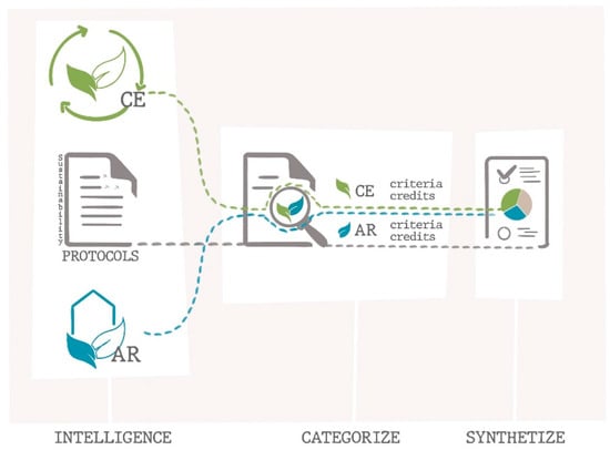 The research methodology employed in this paper includes three phases, namely: (i) the intelligence phase, related to the collection of materials and analysis of the key themes and tools of this paper (CE, AR, and the sustainability protocols); (ii) the categorisation phase, related to an in-depth analysis of the protocols in terms of the proposed criteria and credits; (iii) the synthesis phase that aims to provide a framework of results useful to understand the potential shortcomings in the sustainability protocols with respect to the investigated themes (Figure 1).