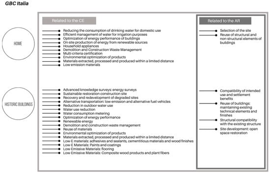 In this section we provide the categorisation of criteria and credits. Since the in-depth analysis provided in this paper focuses on the building scale to better intercept the AR concept, the GBC Home, GBC Historic Buildings, ITACA for residential buildings, and ITACA for non-residential buildings protocols have been investigated, thus excluding applications that include a larger urban scale.