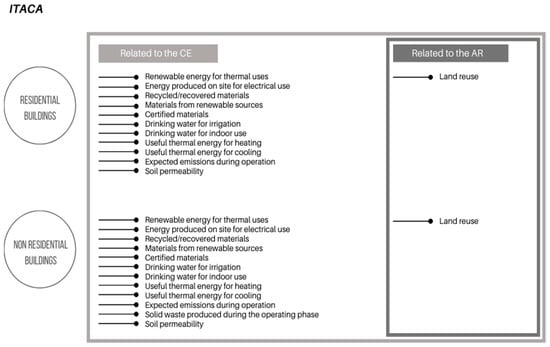 Moreover, according to Figure 3, among these credits those relating to the AR can be highlighted. In particular, Figure 3 shows how the ITACA protocol for residential buildings and the ITACA protocol for non-residential building provide, respectively, 12 and 13 criteria related to the CE. Among those identified criteria both the ITACA protocols underline 1 criterion concerning the AR. Indeed, within both protocols the criterion “Land reuse” is in line with the CE concept aiming to safeguard and enhance the natural capital [], while it refers to encouraging the reuse of previously anthropised, disused or contaminated areas, in order to avoid the consumption of new land, with reference to both land and buildings.