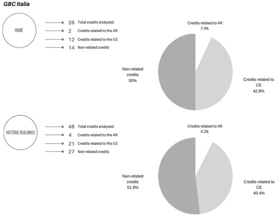 Moreover, according to Figure 2, among these credits those relating to the AR can be highlighted. In detail, Figure 2 underlines how the GBC Home and the GBC Historic Buildings protocols provide, respectively, 12 and 21 credits related to the CE. Among those identified credits the GBC Home protocols underlines 2 out of 12 credits concerning the AR, compared to the 4 out of 21 credits provided by the GBC Historic Building protocol.