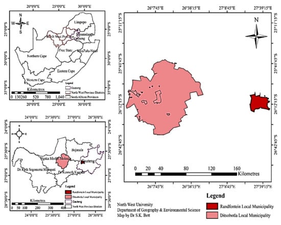 Map of South Africa showing the North West and Gauteng Provinces as well as the sampling locations, that is, Randfontein (Randfontein Local Municipality) and Lichtenburg (Ditsobotla Local Municipality).