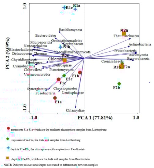 Principal component analysis was performed to test the variations in the microbial functions from each site, the result showing that each sample possesses a distinct functional/metabolic profile (Figure 8). PCA axes 1 and 2 explained 98.9% and 0.49% of the variation, respectively, in the functional categories. The length of the vector arrows showed the strength of dominance of the functions in the samples (the functions on the longest vector length are those which are majorly performed by the microbes in each environment). On the PCA plot, functional categories such as disease virulence and defense, nitrogen metabolism, secondary metabolism, sulfur metabolism and potassium and phosphorus metabolism placed sample F1’s microbiome as distinct from the microbiome of F2, R1 and R2 (Figure 8). This implies that its associated microbiome majorly helps with these functions. This is supported by the prevalence of Aquificales, Bacillales, Myxococcales, Pseudomonadales, Sordariales and Bdellovibrionales in the sample [63] (Figure 4A). These organisms are noted for the above-mentioned functions and other significant contributions to plant growth [47,64].