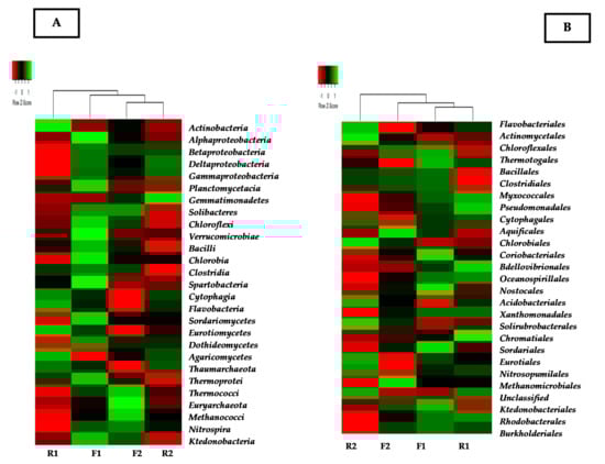 At the order level, Myxococcales, Chloroflexales, Clostridiales, Pseudomonadales, Oceanospirillales, Xanthomonadales, Aquificales, Bdellovibrionales, Thermotogales, Nostocales, Sordariales, Burkholderiales and Chromatiales, were more abundant in F1, while Flavobacteriales, Thermotogales, Myxococcales, Pseudomonadales, Cytophagales, Bdellovibrionales, Oceanospirillales and Rhodobacterales dominated R1. Moreover, Chloroflexales, Aquificales, Nostocales, Sordariales, Methanomicrobiales, Ktedonobacteriales, Actinomycetales and Coriobacteriales were dominant in F2, while Flavobacteriales, Actinomycetales, Acidobacteriales, Eurotiales, Cytophagales, Coriobacteriales, Solirubrobacterales and Nitrosopumilales occurred more in R2 (Figure 4A).