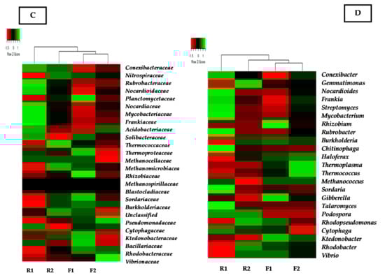 At the family level, Nitrospiraceae, Planctomycetaceae, Burkholderiaceae, Pseudomonadaceae, Thermoproteaceae, Thermococcaceae, Methanomicrobiaceae, Rhizobiaceae, Rhodobacteraceae, Ktedonobacteraceae, Vibrionaceae, Sordariaceae and unclassified taxa were more prevalent in F1 than R1, while Nocardioidaceae, Nocardiaceae, Cytophagaceae, Solibacteraceae, Acidobacteriaceae, Frankiaceae, Rubrobacteraceae, Conexibacteraceae and Mycobacteriaceae were more prevalent in R1 than F1. Planctomycetaceae, Conexibacteraceae, Thermococcaceae, Methanomicrobiaceae, Ktedonobacteraceae, Sordariaceae, Methanocellaceae and Nitrospiraceae occurred more in R2 than in F2, while Acidobacteriaceae, Rhodobacteraceae, Pseudomonadaceae, Vibrionaceae and Cytophagaceae were more dominant in F2 than in R2. The abundance of Methanospirillaceae was about the same in all samples (Figure 4B).