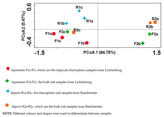 The principal coordinate analysis conducted showed distinct differences between the habitats, which was illustrated by the position of the samples on the PCoA plot (Figure 10). A significant difference was noted in the rhizosphere soils (F1 and R1) and the bulk soils (F2 and R2). The large distance between locations of the rhizosphere samples (F1 and R1) illustrated dissimilarities in their functional groups, with variation also being indicated in the bulk soil samples (F2 and R2), which was represented by the distance between them. Axes 1 and 2 of the PCoA explained 82.85% and 10.72% of the variation across the samples, respectively.