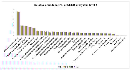 Functional annotation at SEED Subsystem level 2 showed potassium metabolism to be the most dominant. The relative abundances of this across the samples were 14.86% (F1), 14.6% (F2), 14.55% (R1) and 14.2% (R2). The unknown function category was the next dominant group across the samples, with a relative abundance of 6.44% in F1, and 6.01%, 6.05% and 6.04% in F2, R1 and R2, respectively (Figure 9)