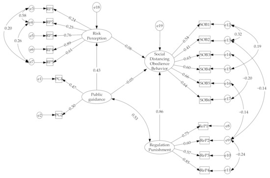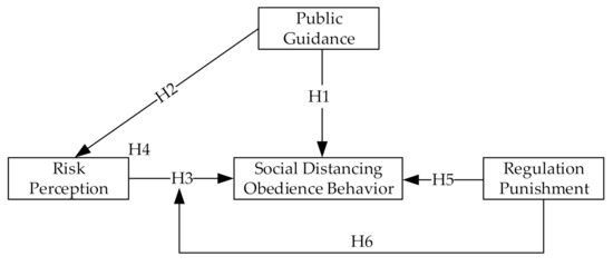 The aim of this study was to comprehensively assess the potential effects of public guidance, risk perception, and regulation punishment on social distancing obedience behavior. A detailed survey was conducted in this study by collecting data from 1064 Chinese residents in January 2021 by means of a questionnaire. Structural equation modeling and hierarchical linear regression analyses were employed to investigate the research hypotheses considered. The outcomes from the conducted analyses showed that the public guidance significantly affected risk perception of individuals, while risk perception had a positive impact on social distancing obedience behavior. Moreover, risk perception was found to play a mediating role in the relationship between the public guidance and social distancing obedience behavior. In addition, the regulation punishment with positively predicted social distancing obedience behavior can have an even greater effect by enhancing risk perception. In terms of comparison between other population subgroups and the general Chinese population, a study in India found a significant correlation between risk perception and knowledge among dental students [58]. This study verifies the promoting effect of public guidance on the risk perception of Chinese people, which is similar to the study in India. In terms of comparison of social distancing with other behaviors, a study in the US showed that participatory dialogue, behavioral confidence, and changes in the physical environment are key influencing factors of hand-washing behavior among college students [59].