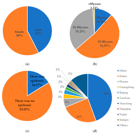 (a) Gender distribution. (b) Age distribution. (c) The epidemic situation in the respondent’s community. (d) Province distribution.
