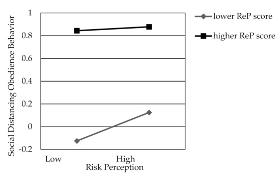 For the same index of the two latent variables, the observed variables of RP5 were canceled to generate a load calculation by the confirmative factor analysis in Amos 24.0. According to the standard load, the observed variables matched according to the principle of “big for big and small for small”, forming interactive items. The developed latent variable interaction model is shown in Figure 5. The path of interactive items was found to be significant as a result of the conducted analysis (see Table 6). Thus, the ReP moderating effect was significant. In addition, we conducted a simple slope analysis for a more direct presentation of the moderating effect (see Table 7). The effect of the high score was 0.017 (−0.063 ~ 0.085, p = 0.676), whereas that of the low score was 0.233 (0.089 ~ 0.424, p = 0.001). A breakdown of the ReP moderating effect is outlined in Figure 6, where it can be observed that regulation punishment encourages social distancing obedience behavior of the public even further by enhancing their risk perception. Hence, the social distancing obedience behavior can be effectively achieved by introducing the punishment measures for noncompliance and enhancing the public risk perception regarding the COVID-19 epidemic. Therefore, hypothesis 6 is supported.
