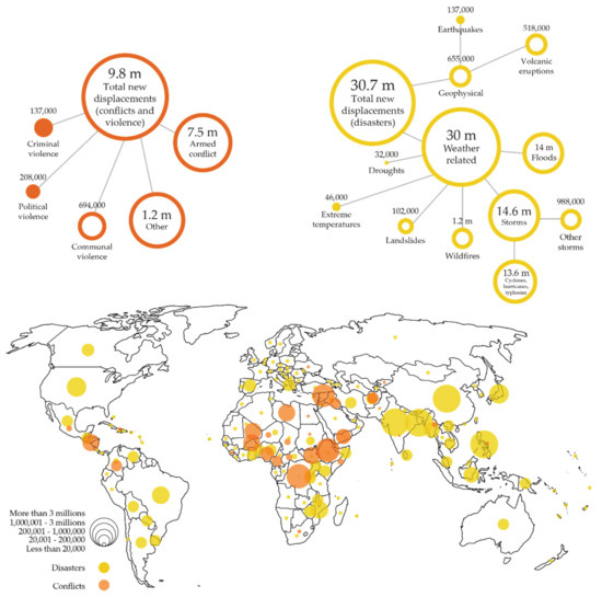 Relevant causes of displacement worldwide are conflicts, which accounted for 8.5 million new displacements in 2019, slightly less than 25% of the total [2]. However, the main cause of displacement worldwide is natural disasters, registering 24.9 million new internal displacements in 2019, 75% of the total, caused mainly by storms [2,5]. This can be seen in Figure 1, which shows, on a world map, the areas affected by displacement related to conflicts in orange, and those related to natural disasters in yellow. As demonstrated, the areas where a greater number of displacements of both types converge are Africa and Western Asia, demarcations close to the European continent. These forced displacements around the world, combined with increasingly prolonged crises, cause situations of great vulnerability and poverty for those affected.
