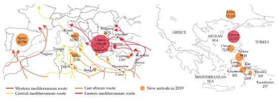 In 2019, Greece became the main entry point for displaced people to Europe through the Mediterranean Sea, as shown in Figure 2, with 65,829 people arriving to the country and Lesbos being the island that received the most arrivals. A third of the people who came to Greece arrived in Lesbos. Most of these entries to Europe were made from Izmir, a coastal Turkish city that is part of the eastern Mediterranean migration route and which has seen its migrant population increase due to the pact between the European Union and Turkey, preventing the passage of migrants to Europe and returns those who arrive to the Greek islands to Turkey [8].